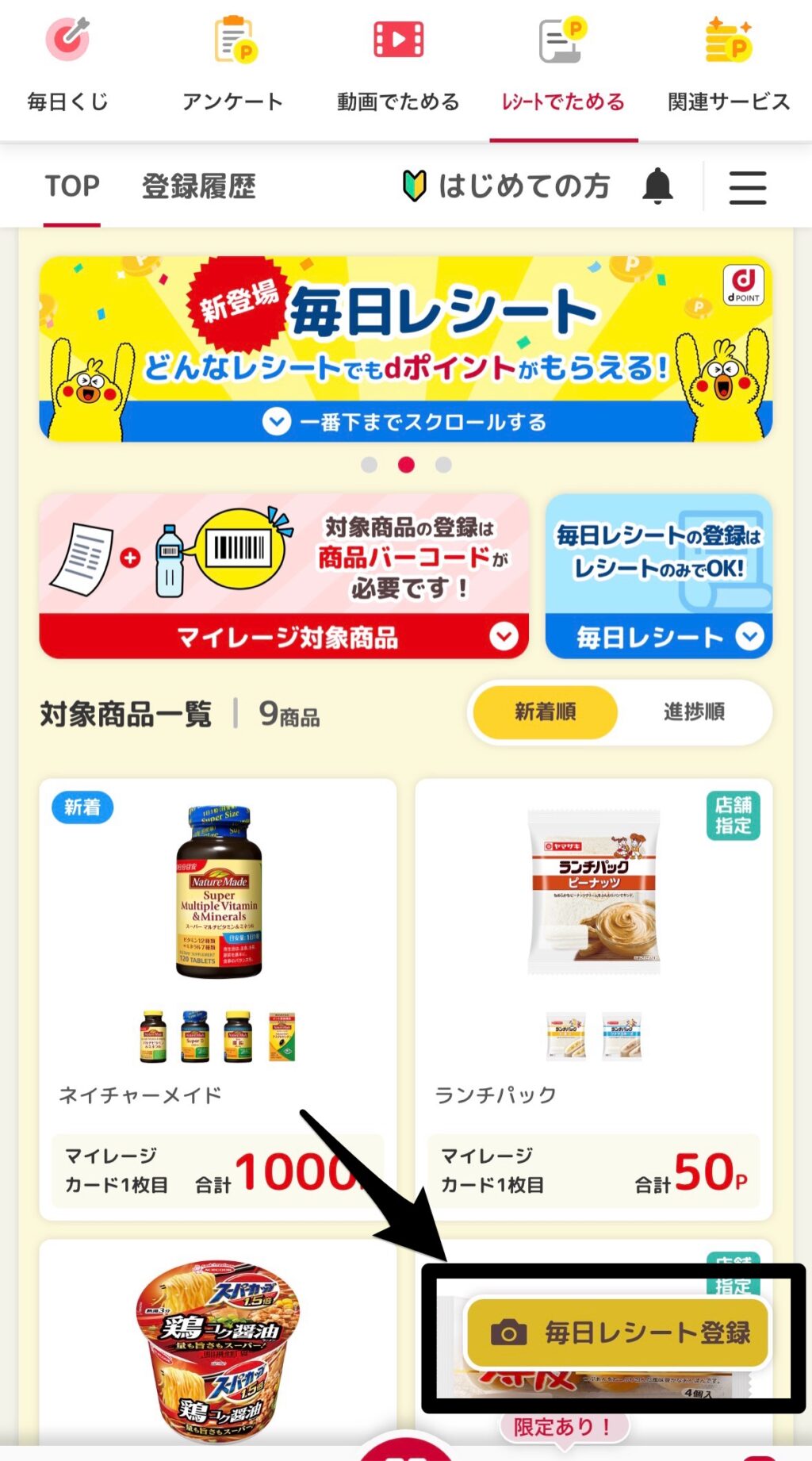 1つ目は、レシート登録は“毎日レシート登録ボタン”ではなく“対象商品一覧上にある購入した対象商品”をタップするという点です。