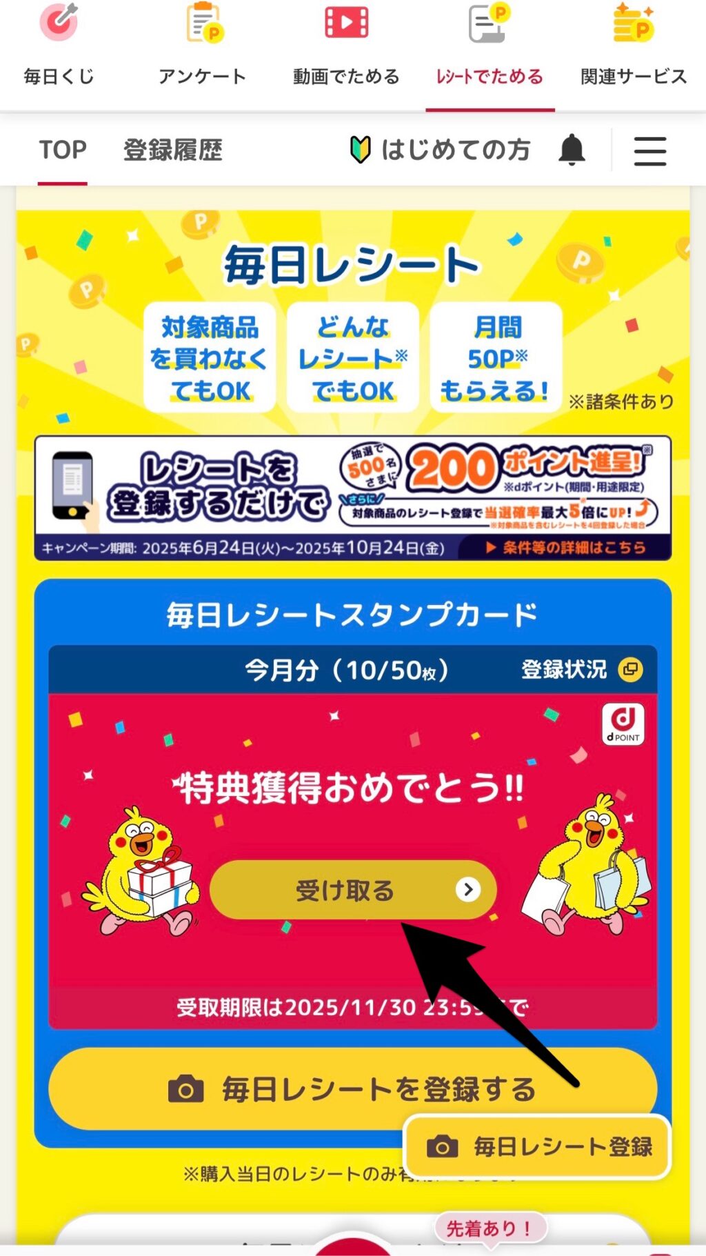 レシート登録をして、審査が終わり、スタンプ10個貯まると、受け取る画面が表示されます!