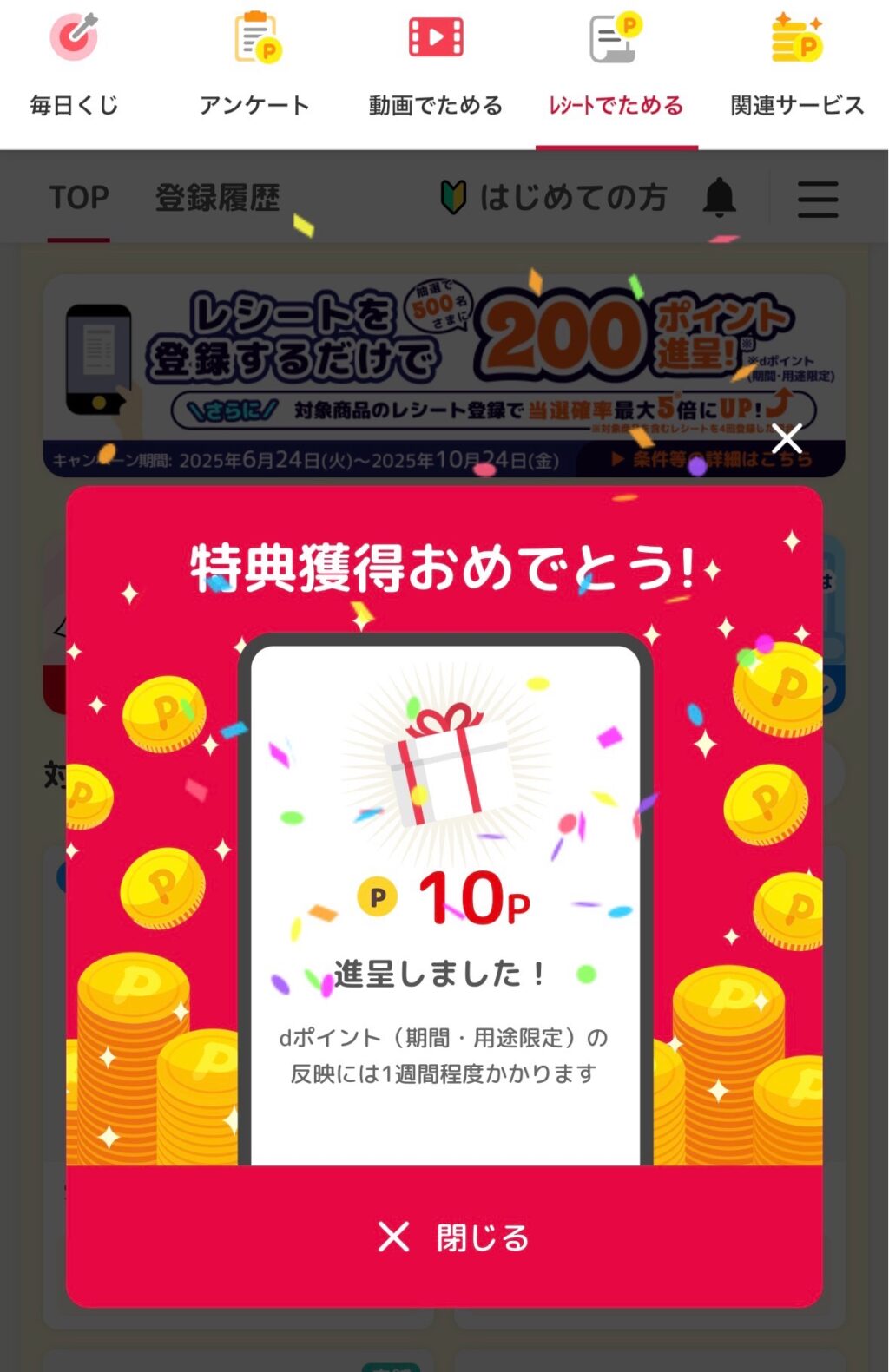 「マイレージ対象商品」でのdポイントの受け取り方は、登録した対象商品の所にポイント獲得の表示が出てきたら、受け取るボタンを押して、ポイント獲得です✨